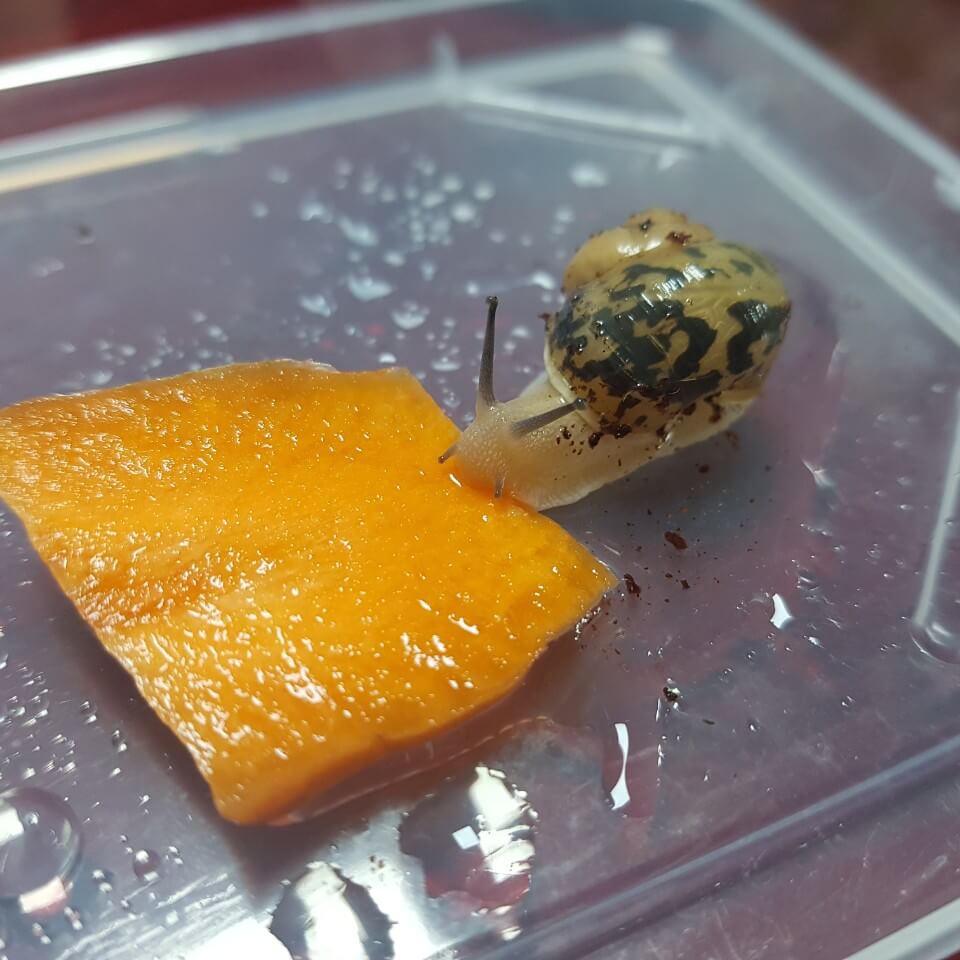 ♣달팽이 아재비. 달팽이 명칭 중 아재비만 달팽이가 먼저 불립니다. 얼핏 보면 명주달팽이와 사이즈, 생김새가 비슷하지만 먹이에 따라 패각에 형광빛이 올라옵니다. 배발도 좀 더 노란 편입니다. 알은 보통 4주 후 부화하고 3달 정도 되면 성체가 되어 교미할 수 있습니다. 목을 길게 길게 뻗는 걸 좋아합니다. 알부터 키우는 걸 어려워하는 분들이 종종 있습니다. ♣충무띠 달팽이. 다른 달팽이에 비해 사람으로 생각하면 소심한 편입니다. 물론 달팽이마다 성격이 조금씩 다른 것도 있습니다만 대체 어린이일 때 소심한 것 같습니다. 커가면서 많이 좋아집니다. 사육 난이도는 쉬움~중간 정도이지만 알을 잘 낳지 않는 편입니다. 얼핏 보면 동양 달팽이와 헷갈린 생김새를 갖고 있습니다. 미색 배발에 목덜미가 얼룩덜룩한 편이며, 패각에는 줄무늬가 있습니다. 알은 보통 4주 후 부화하고 내장산 띠 달팽이처럼 패각에 띠가 나타납니다. 평소 생활 하는 환경에서 쉽게 보기 어려운 달팽이이며 알을 잘 안 낳는 편입니다.