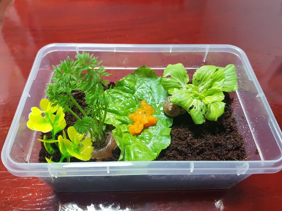 통과 흙이 준비되었다면 환경을 어떻게 꾸며 주면 좋을까? 생각이 되는데, 필자는 달팽이가 좋아하는 환경으로 꾸며준다. 당근에 싹을 틔워 당근 나무를 심어주고, 청경채 큰 잎은 밥으로 주고 작은 잎들이 달린 심지는 청경채 나무로 꼽아준다. 청경채 줄기에 붙어 잎을 먹기도 하고 붙어 잠을 자기도 하고 여러모로 활용을 잘한다. 당근도 청경채도 흙에 심어주기 때문에 무르지 않고 꽤 싱싱함을 유지한다. 당근은 구매 시 되도록 흙당근을 구매하는 것이 좋다. 아침저녁으로 잠시 환기를 시켜주어 건조하지 않은 환경을 만들어 주는 것이 좋다. 흙에 자꾸 분무를 하게 되면 과습이 될 수 있으므로 벽면이나 뚜껑에 분무를 해주는 것이 좋다. 오늘 아침까지만 해도 잘 놀던 아이들이 막을 칠 수도 있고 멍 때릴 수도 있다. 항상 아이들에게 신경 써주는 게 좋은 것 같다. 추운 것 같으면 따뜻할 수 있게 담요를 둘러주고 더워 보인다면 아이스팩을 얹어주어 항상 사육 환경을 체크해 주길 바란다.
